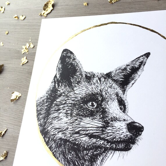 Roter Fuchs Gold Mond Druck Von Original Graphit Zeichnung Etsy