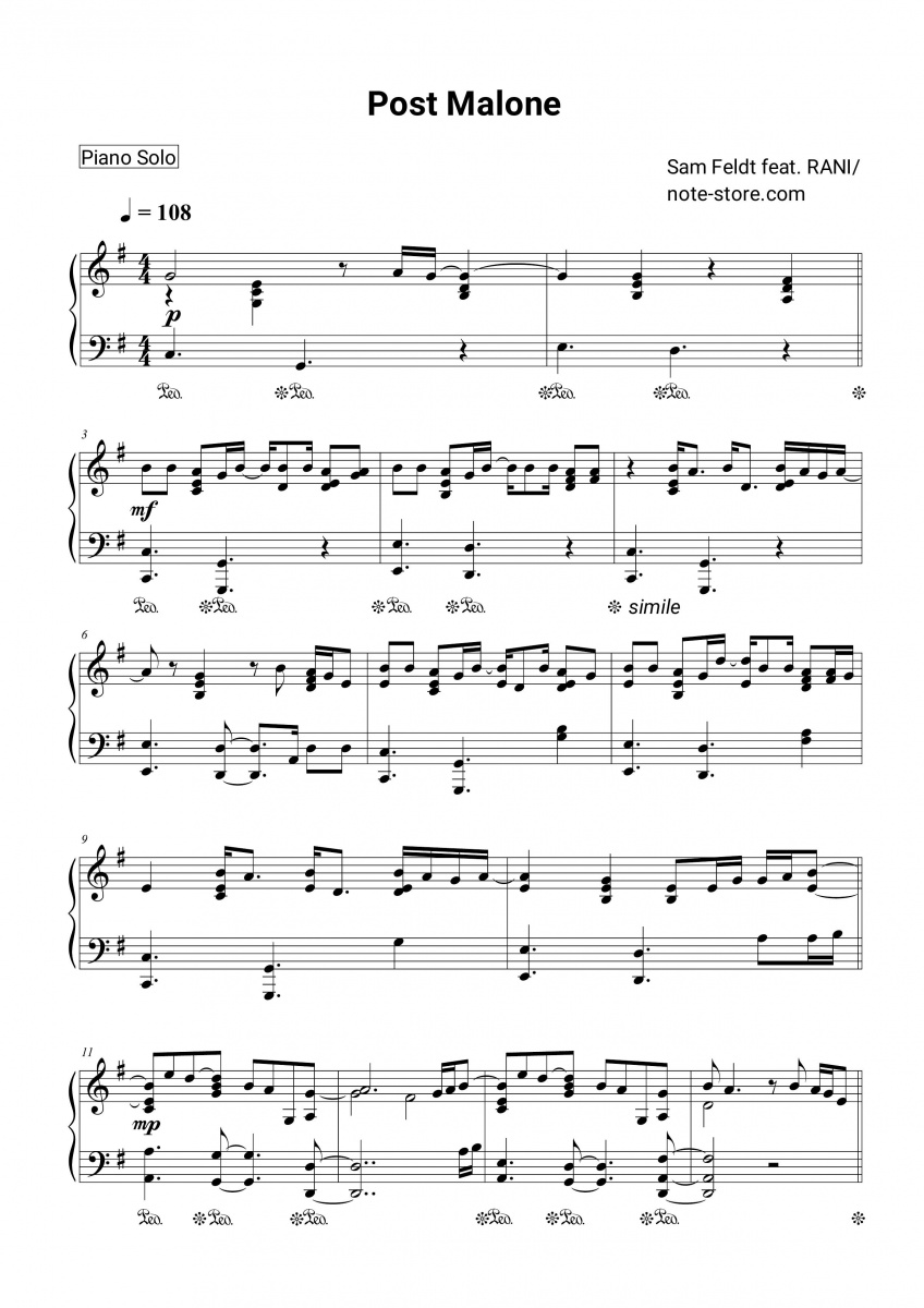 Sam Feldt Rani Post Malone Noten Fur Piano Downloaden Fur Anfanger Klavier Solo Sku Pso