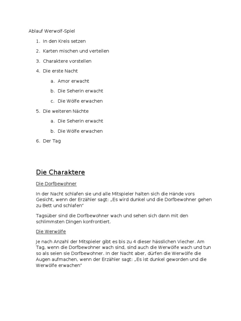 WERWOLFSPIEL Spielsituation Wir befinden uns in dem malerischen Dörfchen Düsterwald Doch die Idylle trügt Seit geraumer Zeit treibt ein Rudel Werwölfe sein Unwesen und jede Nacht fällt seinem unstillbaren Hunger ein Dorfbewohner zum Opfer In dem Bestreben, das Übel auszurotten, greifen die Dorfbewohner. Oder einen Kartensatz auf festes Papier ausdrucken, vielleicht laminieren und zum Schluss schnippeln ;) Spielablauf Erkunde Na Dines Pinnwand „Werwolf Karten“ auf. Die Werwölfe vom Düsterwald (Geschichte zum Spiel) Nacht Title werwolf ausdrucken Created Date 4/22/10 1128 P Jedes Spiel hat verschiedene Teams wie das Dorf oder die Werwölfe, alle kämpfen darum, das letzte lebende Team zu sein.