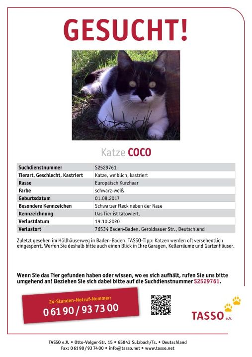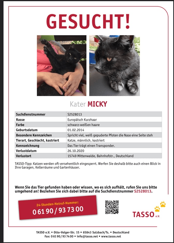 Patricia Wagner > schwarze & schwarzweiße Katzen vermisst / zugelaufen / zu vermitteln Hallo zusammen, bitte keine Links aus EbayKleinanzei gen etc teilen, hier ist die rechtliche Lage aktuell etwas undurchsichtig. Vermisste Katzen / gefundene Katzen všečkov · O tem govori 3014 oseb Europas größte deutschsprachige Katzensuchseite auf Facebook Meldungen. 3011 Katze Mira verschwunden in 140 Berlin weiße Pfoten, weißes Lätzchen Wir vermissen seit Montag, 3011, unsere kleine 6 Monate alte Katze Sie ist grauschwarz getigert, hat ein weißes Lätzchen und 4 weiße Pfoten Hat sie jemand gesehen, hat sie jemand gefunden und mitgenommen?.