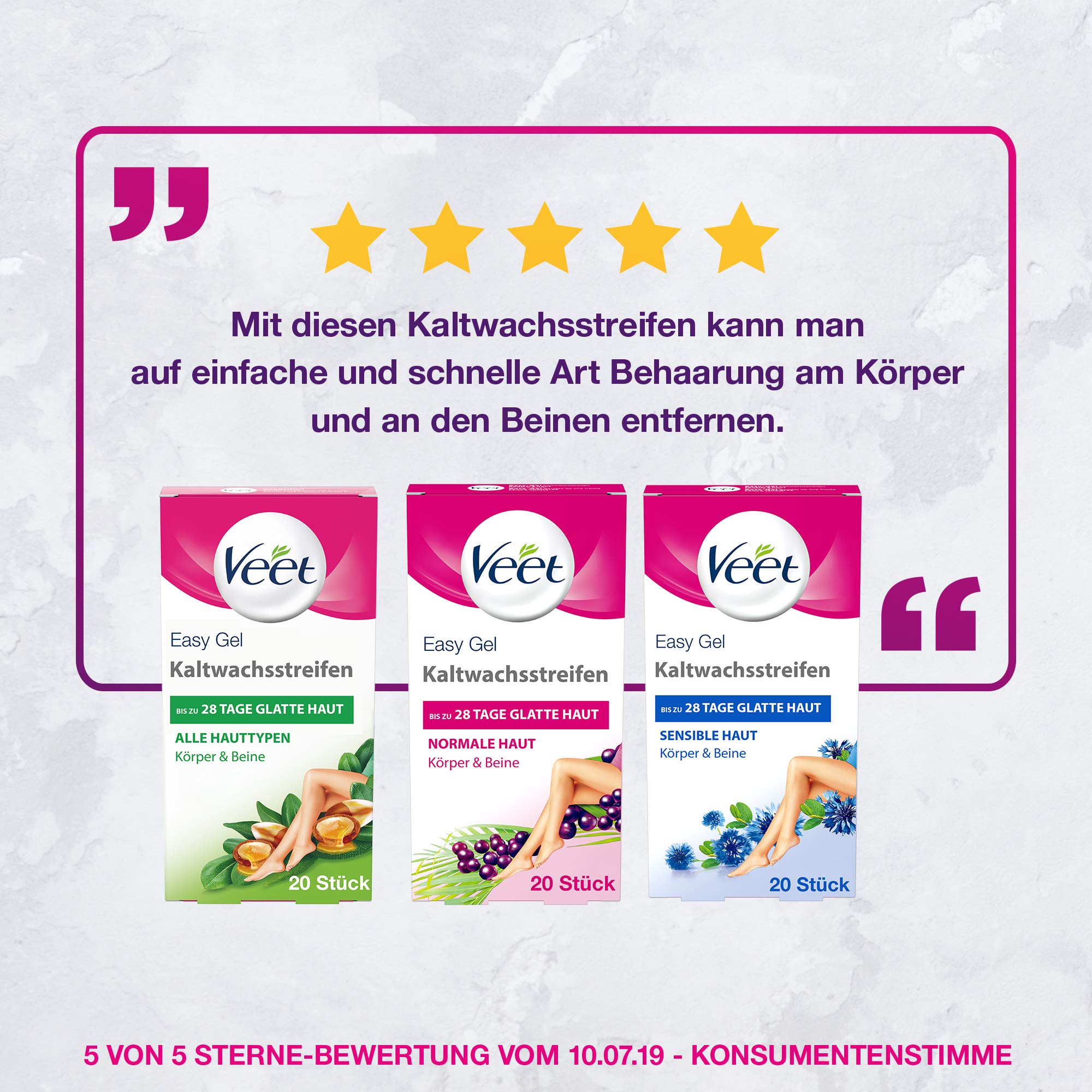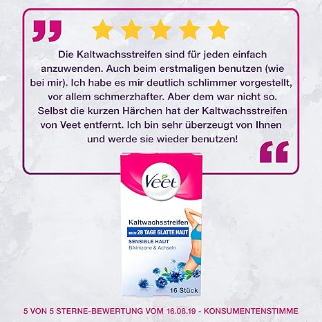Kaltwachs Wir haben die Kaltwachsstreifen von Veet an Frauen getestet Doch die Haarentfernung lief damit schief, das Ergebnis war nur „ausreichend“ Das Wachs klebte stark, Haare ließen sich nur schwer herausreißen Inzwischen hat Veet nach eigener Aussage die Textur geändert. Die spezielle Gelformel der Veet Kaltwachsstreifen mit EasyGel ummantelt und greift aktiv sogar kürzeste Haare ab 1,5 mm Sie entfernt Haare samt der Wurzel und verleiht eine geschmeidige Haut bis zu 28 e lang Dadurch erhältst du langanhaltend glatte Haut ab der ersten Anwendung, selbst wenn du noch keine Erfahrung mit Kaltwachsstreifen. Veet Kaltwachsstreifen mit EasyGelwax Technology – Für das Gesicht – Geeignet für sensible Haut – Bis zu 28 e glatte Haut – 10 x Doppelstreifen Bestseller Nr 1 Veet Kaltwachssstreifen EasyGelwax Technology für die Bikinizone & Achseln für sensible Haut, 1er Pack (1 x 16 Stück).