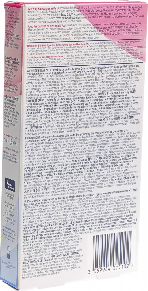 Die Kaltwachsstreifen und die Pflegetücher packen das Problem an der Wurzel Anwendung Einfach einen Veet Kaltwachsstreifen auf die gewünschte Hautstelle drücken, mit einer flotten Bewegung abziehen und mit einem Pflegetuch darüberwischen, um mögliche. Veet EasyGelwax Kaltwachsstreifen für Bikinizone & Achseln 16 Stück selbst wenn Sie noch keine Erfahrung mit Kaltwachsstreifen haben;. Veet Gesicht PräzisionsKaltwachsstreifen Sensible Haut St (PZN ) von Reckitt Benckiser Deutschland GmbH Günstige Online Apotheke Versandkostenfrei mit mycareplus Erfahrungen von Kunden.