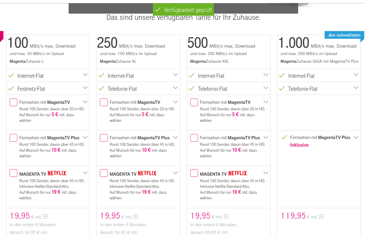 (Internet, Telekom, Glasfaser Ich bezweifle, dass du bei einer 100MbitLeitung auf einen Downloadwert von 146 kommst Außerdem bezweifle ich, dass der Durchschnittswert bei VDSL 50 der Telekom bei 34 Mbit liegt. Die Telekom passt zum Monatswechsel die Preise für ihre GlasfaserTarife an Das leistungsfähigste Paket MagentaZuhause GIGA mit bis zu 1000 MBit/s im Download und bis zu 100 MBit/s Upload. // Telekom Hybrid Hi, wenn bei dir kein regionaler Anbieter ausgebaut hat nutzen die anderen Anbieter die gleiche Leitung, kann also sein dass du auf 6K kommst, eventuell bleibt es aber auch bei 3K Was für einen Router hast du?.