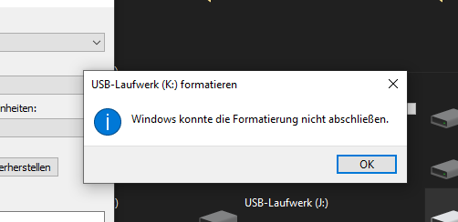 Windows kann formatieren nicht abschließen Helfe beim Thema Windows kann formatieren nicht abschließen in Windows 10 Support um eine Lösung zu finden;. Dann habe ich den USBStick wieder angesteckt Es kam aber nur das Fenster, dass ich ihn formatieren soll Ich bin also wieder an meinen anderen Rechner um ihn zu formatieren Wenn ich das nun tun will kommt die Nachricht "Windows konnte die Formatierung nicht abschließen" Habt ihr ne Ahnung wie ich das wieder hinbekomme?. USBStick Fehler lässt sich nicht öffnen "billig"Produkt das war ein 32er# #Meine "Supersticks" liessen sich leider auch auf diese Weise nicht öffnen# #der ist schrott unter folgendem namen umbenannt PENDRIVE ich habe die hardware nicht sicher entfernen können, das ging iwie nicht, dann wegwerfen# #ich habs jetzt rausgefunden, wie er sich öffnen lässt ja, ich weis das war.