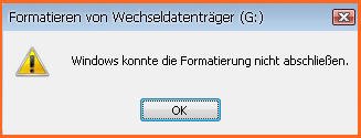 Usb stick windows konnte die formatierung nicht abschliessen. Ohne böse sein zu wollen, aber Wer lesen kann ist klar im Vorteil Zeile 8 "Windows konnte die Formatierung nicht abschließen" Das geht nicht, weil keine Partitionsdaten mehr da sind. Formatier ich über die Datenträgerverwaltung erscheint "Die Formatierung konnte nicht fehlerfrei durchgeführt werden" In der Datenträgerverwaltung ist der USB Stick jeweils als fehlerfreie primäre Partition mit RAW Dateisystem aufgeführt Auf meinen Laptops sowohl unter Vista als auch Windows 7, funktionieren die Sticks einwandfrei Die. Hallo zusammen, ich habe das gleiche Problem mit einer iomega rev disk 35gb, es kommt auch die Meldung Windows konnte die Formatierung nicht abschließen und wenn ich bei diskpart list disk.