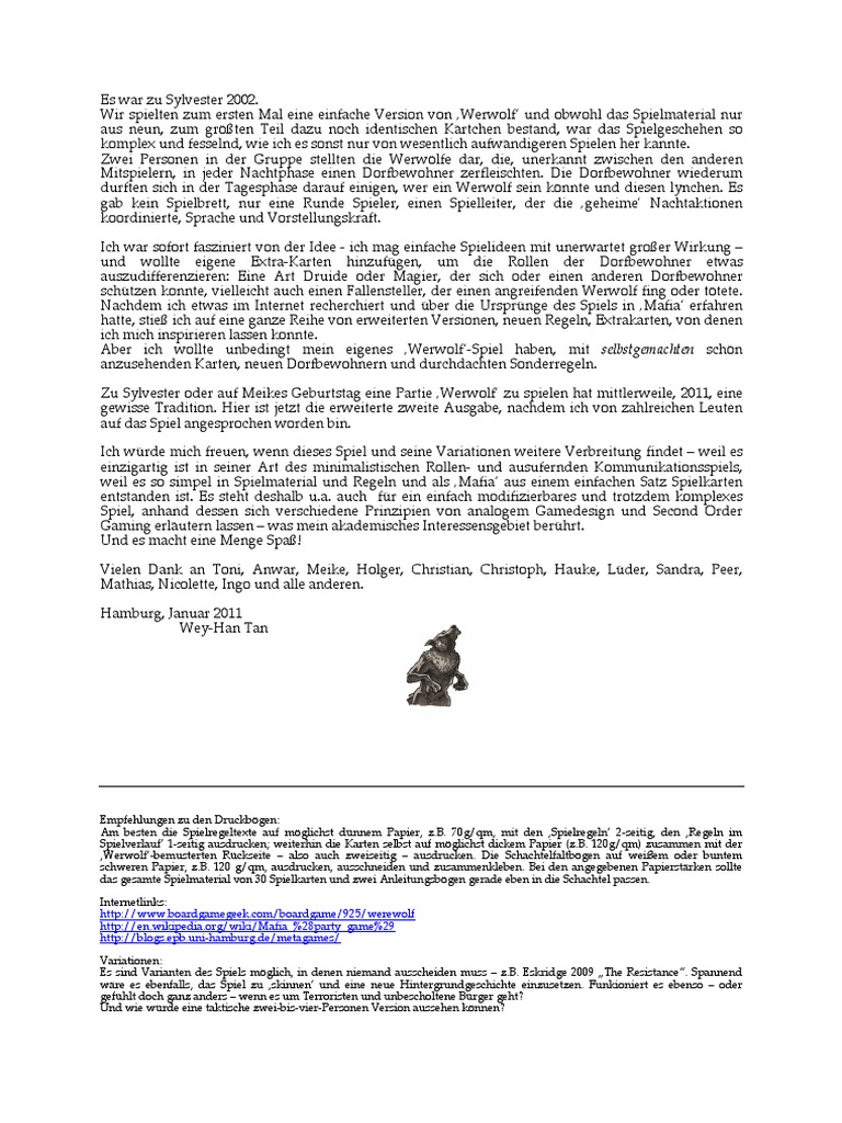 Title werwolf ausdrucken Created Date 4/22/10 1128 PM. WERWOLF Ein LangzeitSpiel für 1050 Personen Das Spiel baut auf dem Spiel „Die Werwölfe von Düsterwald“ (franz Les loupsgarous de Thiercelieux) von Philippe des Phallières und Hervé Marly, erschienen 01 bei luimême, auf Dessen Vorlage war wiederum das bekannte Spiel Mafia, welchem Andrew Plotkin ein WerwolfThema gegeben hatte. Werwolf Spiel Alle Karten Zum Ausdrucken Asmodee Germany Die Werwölfe Von Düsterwald Reihe Werwolf Die W Jubiläumsausgabe Ulisses Spiele Arbeitsblatt Lesetext Für Eine Lesenacht Deutsch Gemischte Themen Werwolf Spieler Wien Werwolf Spieler Wien Werwölfe Von Düsterwald Test Anleitung Tipps.