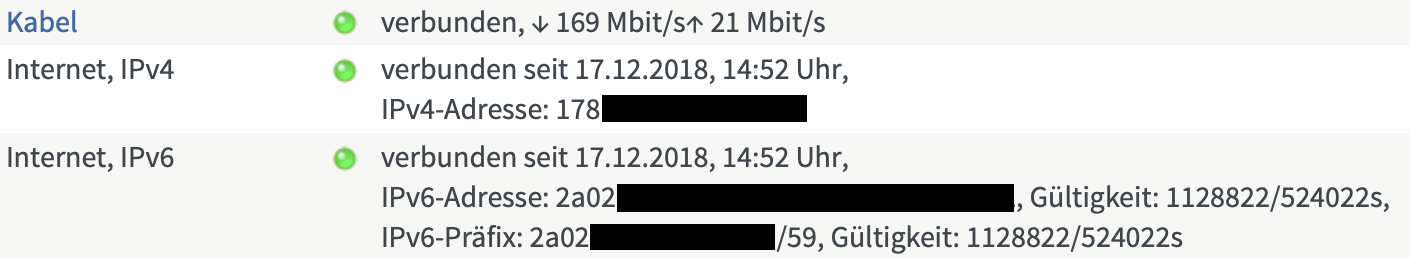 Im Forum gibt es ja schon einige Beiträge zu Unitymedia & IPv6, aber finde ich alles noch nicht so befriedigend, ebenso wie das "offizielle" Material von Unitymedia (nämlich gar nichts) dazu Habe gestern eine längere Session mit verschiedenen Mitarbeitern der Hotline gehabt und zwischendurc. Hallo, ich hatte bisher einen 6to4 Tunnel via T erfolgreich ipv6 in Betrieb Jetzt habe ich mit Cablemax und einer FRirtzbox 6591 auf Unitymedia Vodafone auf 1GBit und Dual Stack mit Ipv4 und IPv6 aufgerüstet Hinter der Fritzbox läuft ein Lancom 178. Wie nutze ich die IPv6Adresse Der Endanwender wird automatisch umgeschaltet Viele neue Router haben die Nutzung von IPv6 voreingestellt Sofern die Webseite das kann Neue Smartphones wählen sich meist automatisch so ein, dass eine IPv6Adresse als erstes genutzt wird, ist diese nicht vorhanden, greift das Gerät auf IPv4 zurück.