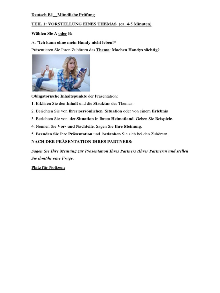 Deutsch B1 Mundliche Prufung Teil 1 Vorstellung Eines Themas Ca 4 5 Minuten Wahlen Sie A Oder B