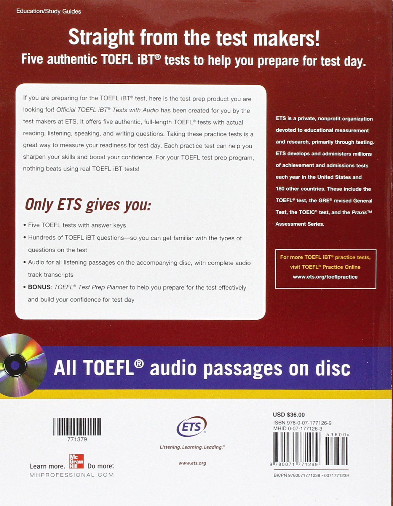 Punkte mit dem TOEFLTest!. Official TOEFL iBT Tests with Audio contains five actual retired TOEFL test forms with authentic TOEFL reading, listening, speaking, and writing questions Each form includes an answer key and complete audio transcripts You also get audio for all the listening passages of the tests, provided on the accompanying audio CD Provides more than 300 real TOEFL questions from the testmakers. The TOEFL iBT test is a computer based test It confirms that a student has the English language skills necessary to succeed in an academic setting That’s why it is the most highly regarded and widely accepted test in the world.