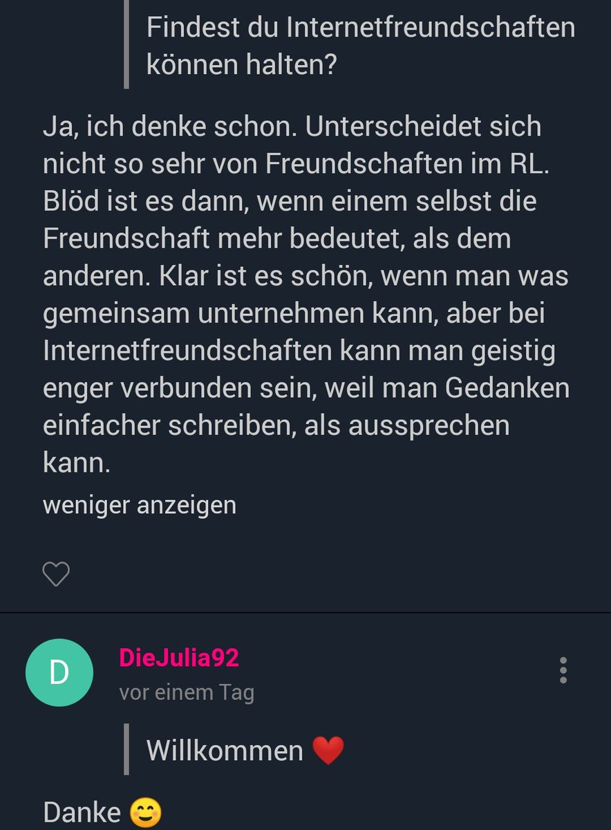Mit Tellonym kann man Freunden oder Fremden anonyme Fragen stellen In diesem Praxistipp geben wir Ihnen Ideen für interessante Fragen, die Sie stellen können. Liebe hat erfreulicherweise ganz viele Gesichter Ich möchte dich lediglich dazu einladen, einmal zu überlegen Was bedeutet Liebe eigentlich für mich?. Liebe Edith, ich glaube, Deine Freundin wird ewig an diesen einen Valentinstag zurückdenken Ein tolles Bild, auch wenn es bestimmt eine Menge Arbeit war Es hat sich gelohnt, wunderschön Hier gibt es etwas Süßes für jeden, schön verpackt und dann gehen wir alle vier abends schön essen Das ist unser Valentinstag.