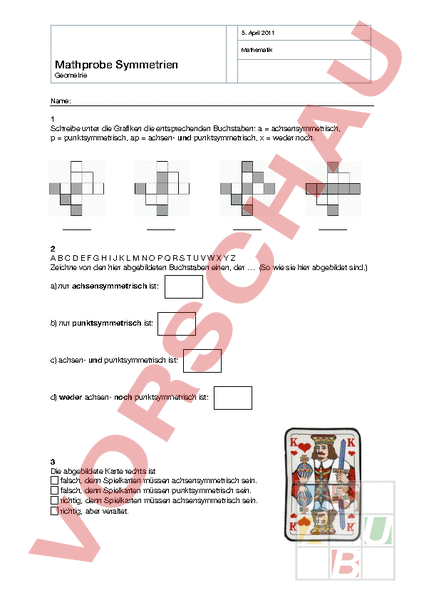 Probearbeit Symmetrien und Winkel 1 a) Welche der Figuren sind achsensymmetrisch?. Am einfachsten kann man sich Punktsymmetrie und yAchsensymmterie veranschaulichen, wenn man sich das Ganze in einem Korrdinatensystem anzeigen lässt Unterhalb sind zwei Funktionen die erste ist punktsymmetrisch zum Ursprung, die zweite yAchsensymmetrisch Die Striche auf dem Graphen (rot) geben an, dass zwei Linien die gleiche Länge haben. Arbeitsblätter zum Ausdrucken von sofatutorcom Punktsymmetrisch oder achsensymmetrisch 1 Nenne die symmetrischen Verkehrsschilder und die Art der Symmetrie 2 Gib an, welcher Buchstabe symmetrisch ist 3 Bestimme symmetrische Gegenstände aus dem Haushalt 4 Bestimme die Anzahl der Symmetrieachsen 5 Prüfe, ob eine Form der Symmetrie vorliegt 6 Entscheide, wer mehr Symmetrieachsen hat.