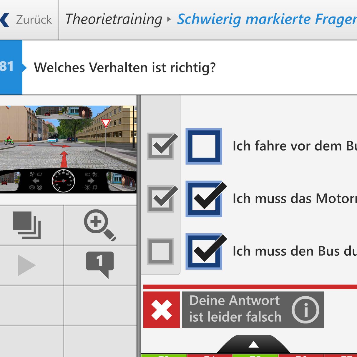 Welches Verhalten ist richtig?. Richtige Antworten 1,2 Abschnitt 1301 Punkte 5. Ich fahre vor dem Bus Variation zur Mutterfrage Ich muss den Bus Variation zur Mutterfrage durchfahren lassen Ich muss das Motorrad Variation zur Mutterfrage durchfahren lassen Warum darf man nicht unnötig langsam fahren?.