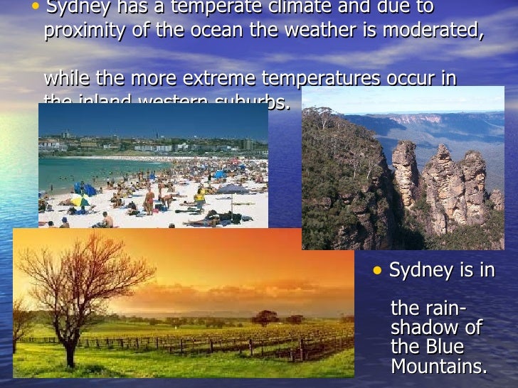 • Sydney is in the rain shadow of the Blue Mountains 6 Climate• Due to being located in the southern hemisphere, summers and winters are reversed• January is the warmest month, with an average temperature range of °C (6578°F)• July is the coldest month, with an average temperature range of °C (4661°F)•. Wäre sehr lieb Das ist nur der Teil basic informations, fehlt etwas?. Wäre sehr lieb Das ist nur der Teil basic informations, fehlt etwas?.