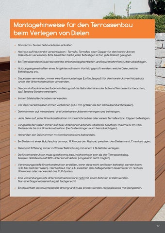 Montage von HQ WPCTerrassendielen mit Anfangsclip aus Edelstahl (Artikelnr ) Für die Montage der HQ WPCTerrassendielen auf der HQAluminiumUnterkonstruktion verwenden Sie bitte für den Anfangsclip Edelstahlschraube gehärtet, schwarz beschichtet, 4,0 x 25 mm, mit Bohrspitze (Artikelnr ). In unserer Gartenausstellung können Sie aus einem breiten Sortiment unterschiedlicher massiver Terrassendielen und WPCDielen wählen Holzbeläge für Terrassen erfordert die richtige Produktauswahl, sorgfältige Planung und korrekte Verlegung wenn möglich nie Holz auf Holz direkt verschrauben Abstandshalter verwenden Immer genügend. Gleichzeitig sieht man die Schraubköpfe in den Dielen Für die BPC und WPC Terrassendielen bieten wir Ihnen eine sinnvollere Möglichkeit Die Metall Clips werden direkt an die Dielen angelegt und in die Unterkonstruktion geschraubt Über ein KlickSystem halten die Dielen fest, ohne Schraub oder Steckverbindungen zu erkennen.