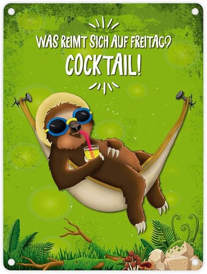 Trendaffe Metallschild Mit Faultier In Hangematte Motiv Und Spruch Was Reimt Sich Auf Freitag Cocktail Amazon De Garten
