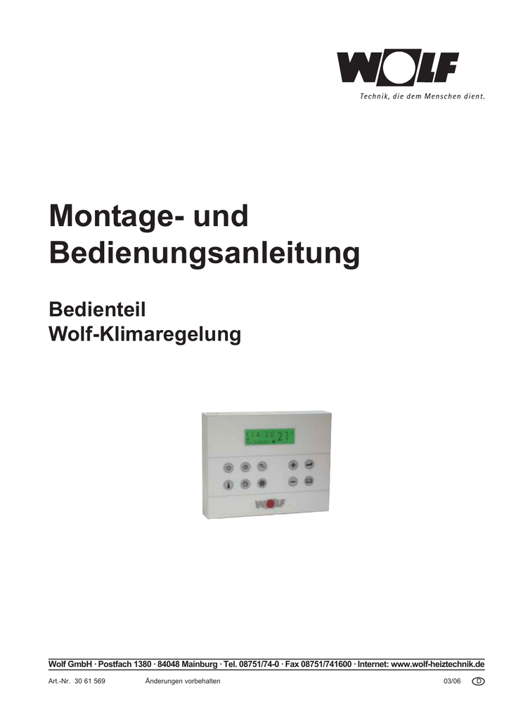 Wolf Lüftung, Heizung, Sanitär, Gas GmbH mit Sitz in Braunschweig ist im Handelsregister mit der Rechtsform Gesellschaft mit beschränkter Haftung eingetragen Das Unternehmen wird beim Amtsgericht Braunschweig unter der HandelsregisterNummer HRB 6022 geführt Die letzte Änderung im Handelsregister wurde am vorgenommen. WOLF GmbH • Postfach 1380 • D Mainburg Tel • /740 • wwwwolfheiztechnikde DE ArtNr _1510 Änderungen vorbehalten Heizung Warmwasser Heiztherme Warmwasser Kombitherme Standby i Heizung aus / Frostschutz Zum Einstellen der aktuellen Uhrzeit und zum. Startseite / Lüftung, Heizung, Klima / WOLF / Wolf ART 2A Raumtemperaturregler Wolf ART 2A Raumtemperaturregler 100,00.