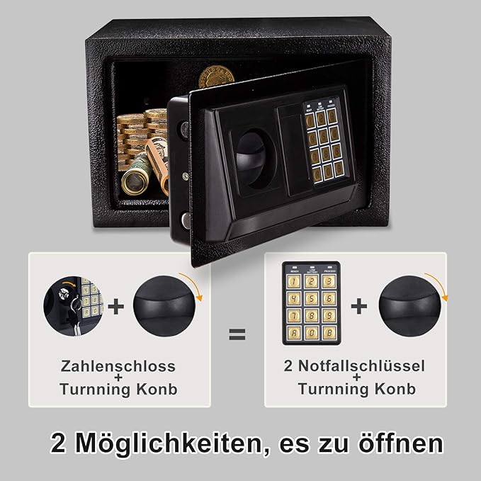 Elektronisches Zahlenschloss Einfach die gewünschte Zahlenkombination eingeben und schon lässt sich der Tresor öffnen Mit solch einem Schloss lässt sich der Tresor durch einen herkömmlichen Doppelbartschlüssel oder ganz einfach und bequem via Zahlencode entsperren. Ja, es sind 4 Batterien enthalten Diese finden Sie entweder im Tresor oder außen im Verpackungsmaterial Hat die Elektronik ein Notschloss mit Schlüsseln?. Der sichere Tresor mit Zeitschloss sorgt nicht nur für das kontrollierte Verschließen, sondern auch das Öffnen des programmierten Zeitschlosses Der Inhaber entscheidet selbst, wann sich der Tresor das nächste Mal öffnen lässt Dies geschieht mittels eines Zeitintervalls, der vor dem Verschließen eingestellt werden muss.